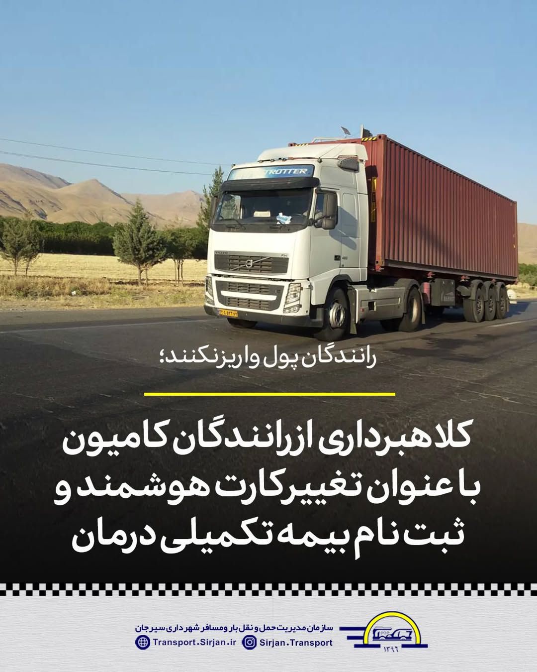 به گزارش تین نیوز ، این انجمن با ارسال نامه ای به سازمان راهداری و حمل و نقل جاده ای از این سازمان درخواست کرده، با ارسال پیامکی به رانندگان کامیون، آنان را نسبت به عدم واریز وجه در زمینه تغییر کارت هوشمند یا ثبت نام بیمه تکمیلی دی ، آگاه سازد.