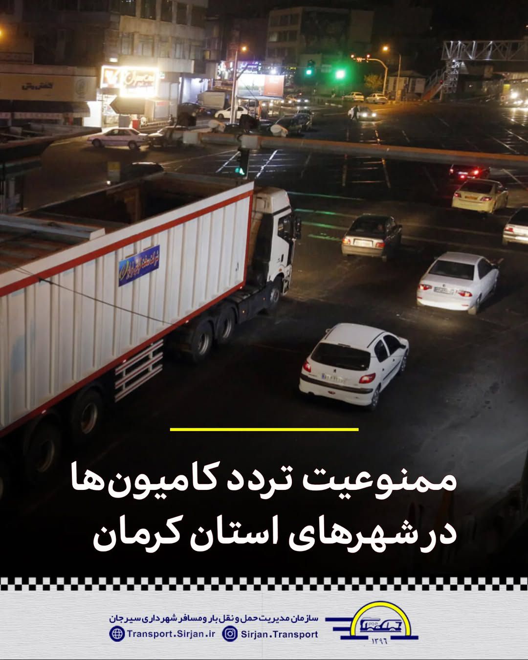 رئیس پلیـس راهور استان کرمان با اشاره به ترافیک نیمهسنگین همزمان با ساعات آغاز بهکار مدارس، از ممنـوعیت تردد کامیونها در شهرهای استان در این ساعات خبر داد.