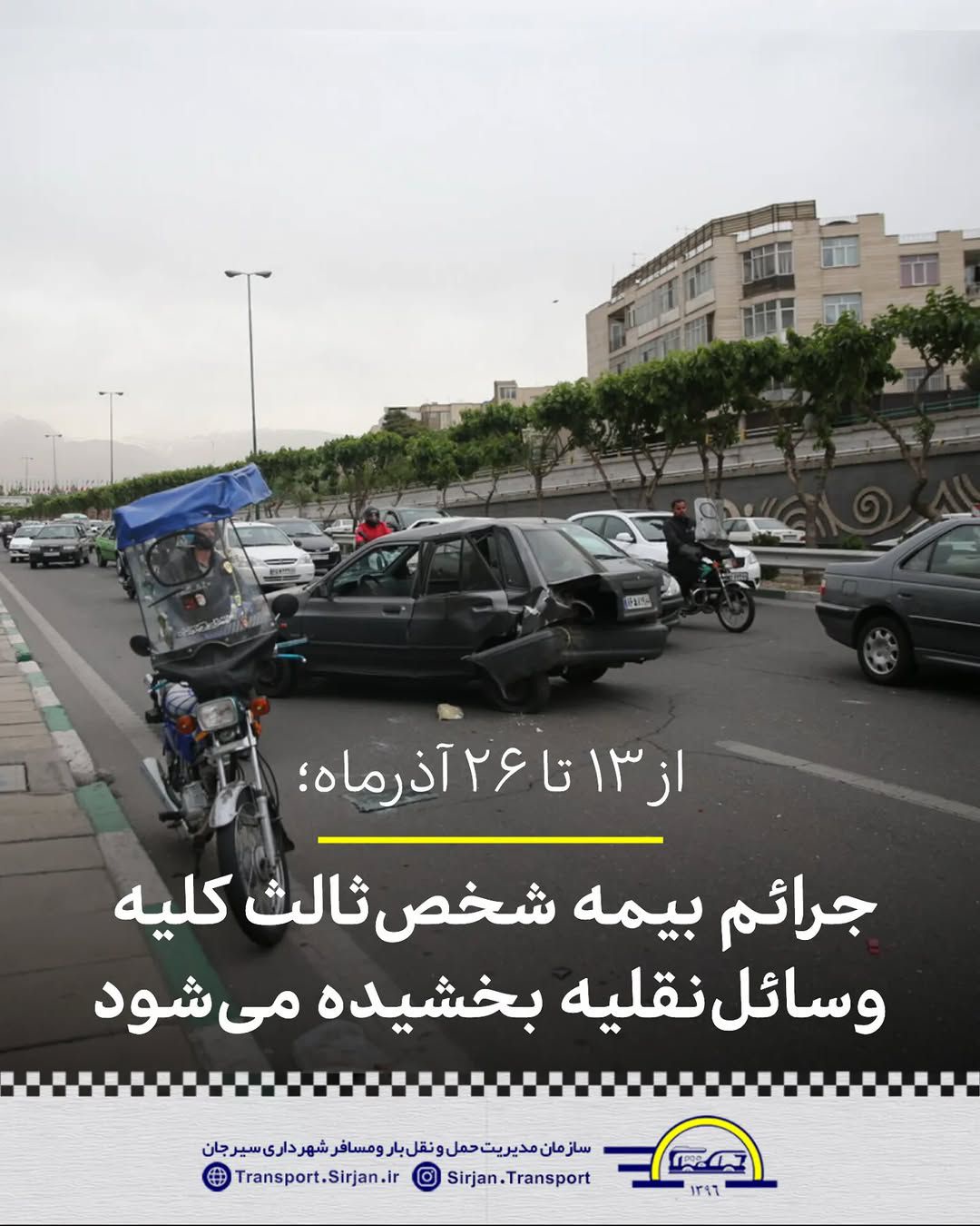 ادامه مطلب: از ۱۳ تا ۲۶ آذرماه؛ جرایم بیمه شخص ثالث کلیه وسایل نقلیه بخشیده می شود